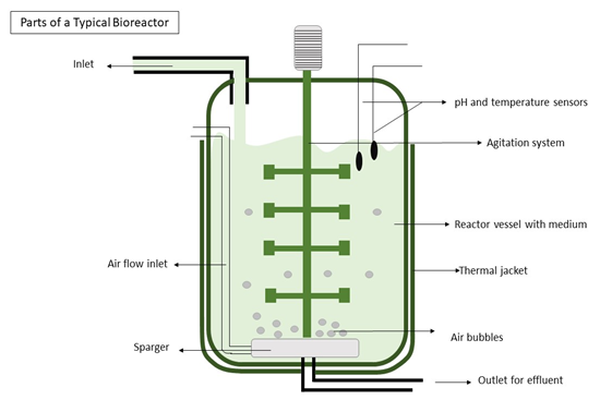 典型的生物反應器具有以下部件:主容器或罐、冷卻和加熱系統、完善的曝氣系統、進料口、泡沫控制系統和排汙口。