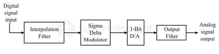 Σ-Δ 數模轉換器首先將數字訊號輸入轉換為高頻位元流,然後對位元流進行濾波和積分以產生模擬輸出。
