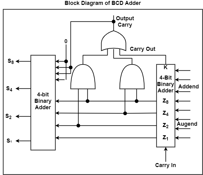 BCD加法器是一個電路,它並行地對兩個BCD數字進行加法運算,並生成一個也是BCD格式的和數位。BCD加法器在其內部結構中應該包含校正邏輯。為了將0110新增到二進位制和中,我們使用第二個4位二進位制加法器,如圖所示。