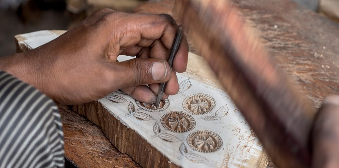 顧名思義,製作或準備熟練雕刻的木塊以在織物上印記是套印的第一步,也是最重要的一步。主要由石灰木、梧桐木、冬青木或梨木製成的印版經常用於紡織品印刷。如果有人尋求更經濟的解決方案,可以考慮使用雲杉或松木。大多數印版厚度為 2-3 英寸。成本較低或質量較差的木塊通常是扭曲在一起的,這意味著幾個部分粘合在一起。在印版均勻間隔後,可以使用鑿子、圓規或刀子進行設計工作。