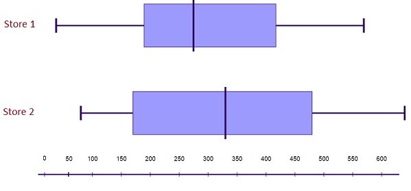 答案 - 建立兩個箱線圖,一個用於商店 1,一個用於商店 2,以比較兩家商店的銷售業績。