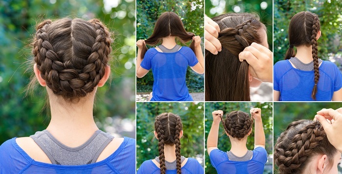 將底部辮子纏繞在頂部辮子周圍,將底部辮子的末端塞到頂部辮子下方,並用髮夾固定。