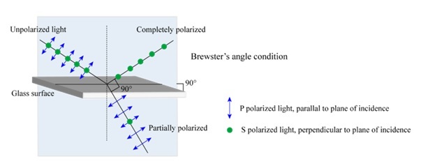 我們知道,沒有哪種材料是光的完美反射體、吸收體或透射體。如果存在這樣的材料,它們將是隱形的、完全白色的或黑色的。相反,光的部分總是被反射或吸收。特定偏振的光可以被完全透射。請注意,**光的偏振**是指其電場分量振動的方向。當特定方向偏振的光以一定角度入射到透明介面的邊界時,不會吸收反射。這個角度稱為布儒斯特角,這個角度和所涉及的兩種材料的折射率之間的關係由布儒斯特角定律給出,其公式為