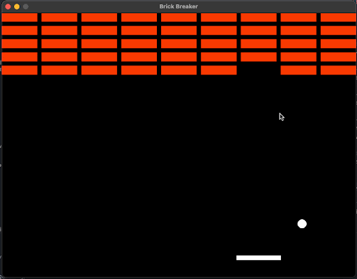 最後,我們需要實現球和磚塊之間的碰撞檢測。為此,在遊戲迴圈中新增以下程式碼。它透過從遊戲中移除發生碰撞的磚塊來處理磚塊碰撞。