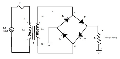 橋式波整流器具有橋式整流器的配置。$\mathrm{D_1, D_2, D_3}$和$\mathrm{D_4}$二極體像橋式整流器一樣以惠斯通電橋配置設定。$\mathrm{R_L}$是負載電阻。A和C端連線到次級變壓器的兩端。變壓器的次級端表示為$\mathrm{S_1}$和$\mathrm{S_2}$。交流訊號連線到初級變壓器。正半週期由二極體$\mathrm{D_1}$和$\mathrm{D_2}$調節。負半週期由二極體調節。在兩個半週期的結束時,負載電流流過電路。