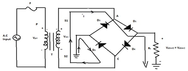 A和C端連線到次級變壓器的兩端。變壓器的次級端表示為$\mathrm{S_1}$和$\mathrm{S_2}$。交流訊號連線到初級變壓器。正半週期由二極體$\mathrm{D_1}$和$\mathrm{D_2}$導通。負半週期由二極體$\mathrm{D_3}$和$\mathrm{D_4}$導通。在兩個半週期的結束時,負載電流流過電路。
