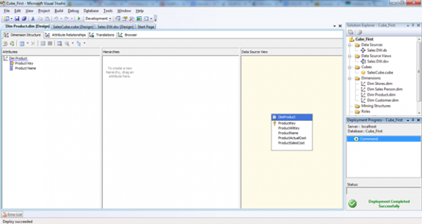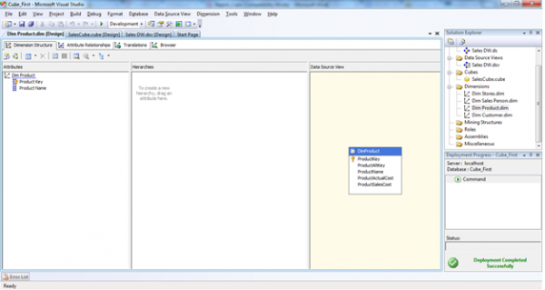 6. 現在修改查詢的維度。在解決方案資源管理器中,雙擊維度**Dim Product ->** 將“產品名稱”從資料來源檢視中的表拖放到左側的屬性窗格中。