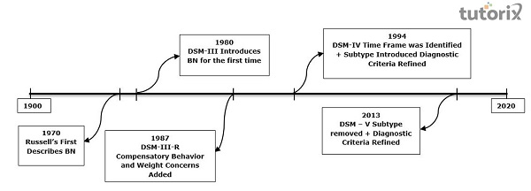 1900 年代,傑拉德·羅素 (Gerald Russell) 在科學文獻中首次描述了神經性貪食症,將其稱為厭食症的“不祥變體”。它首次被新增到 DSM-III 中,強調暴食,並在後來的 DSM-III-R 中進行了更多探討,其中增加了代償行為和對體重的關注的組成部分。在此基礎上,診斷標準在 DSM-IV 和後來的 DSM-V 中得到了進一步改進。