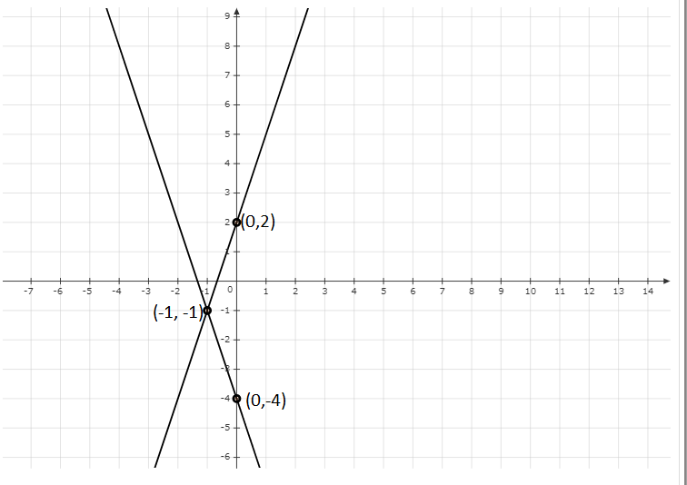 在座標系上繪製點 $(-1,\ -1)$ 和 $( 0,\ 2)$,並連線它們得到方程 $6x-2y+4=0$ 的影像。