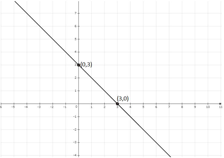在座標系上繪製點 $( 0,\ 3)$ 和 $(3,\ 0)$,並連線它們得到方程 $x+y=3$ 的影像。