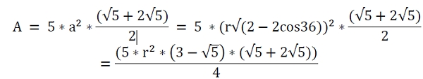 float area = (5 * pow(r, 2) * (3 - sqrt(5)) * (sqrt(5) + (2 * sqrt(5)))) / 4;