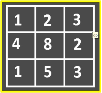 成本在影像中給出。路徑將是 (0, 0) ⇒ (0, 1) ⇒ (1, 2) ⇒ (2, 2)。路徑值為8 (1 + 2 + 2 + 3)。