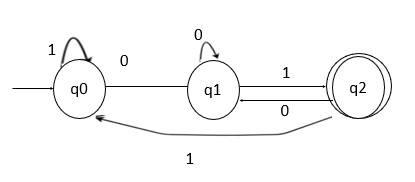 q2 − 輸入0時,它進入狀態q1;輸入1時,它進入狀態q0。狀態q2是最終狀態。