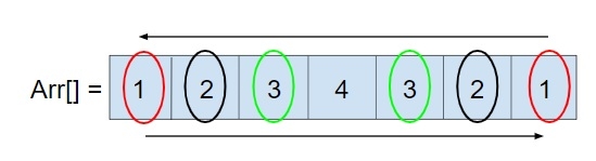 因此,要檢查一個數組是否是迴文陣列,我們可以從頭到尾遍歷陣列,就像 −