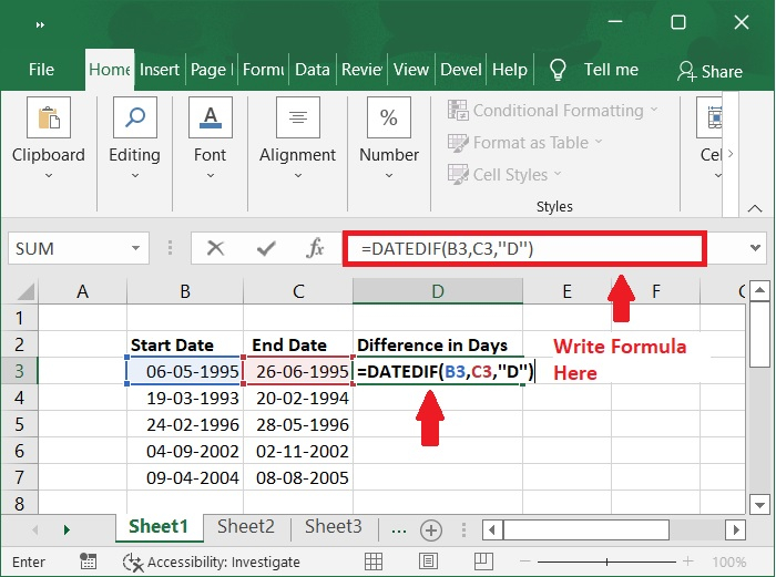 您可以使用以下公式來計算兩個特定日期之間相差的天數。