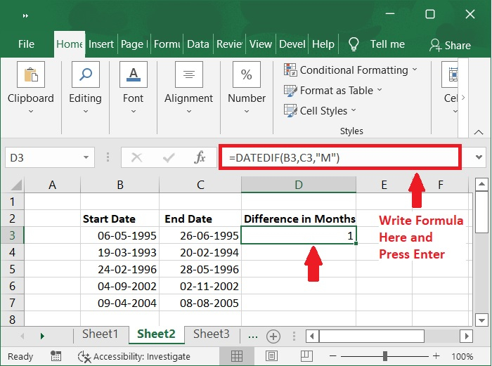 將以下公式輸入到空白單元格中,以確定兩個特定日期之間相差的月數。