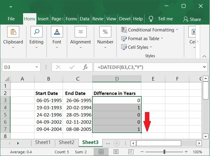 然後,將填充柄向下拖動到單元格中以使用此公式。兩個特定日期之間相差的年數已返回,如下面的螢幕截圖所示。