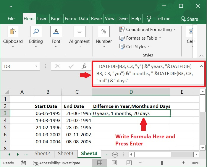 =DATEDIF(B3, C3, "y") &" years, "&DATEDIF(B3, C3, "ym") &" months, " &DATEDIF(B3, C3, "md") &" days"