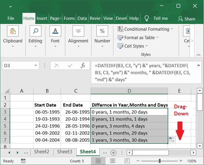 然後,透過向下拖動填充柄到單元格中,將確定兩個日期之間相差的天數,如下面的螢幕截圖所示。
