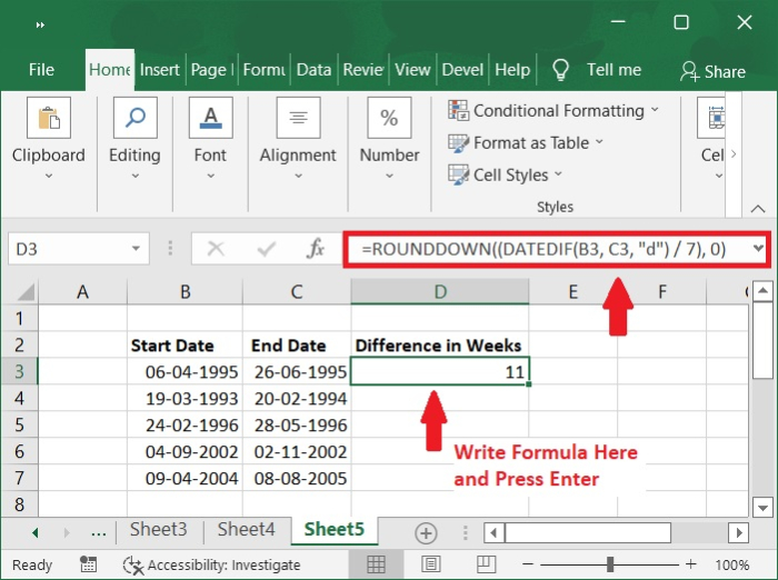 =ROUNDDOWN((DATEDIF(B3, C3, "d") / 7), 0)