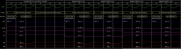 **總結** - 因此,此指令 **CNZ** 需要 3 個位元組、5 個機器週期(操作碼獲取、記憶體讀取、記憶體讀取、記憶體寫入、記憶體寫入)和 18 個 T 狀態才能執行,如時間圖所示。