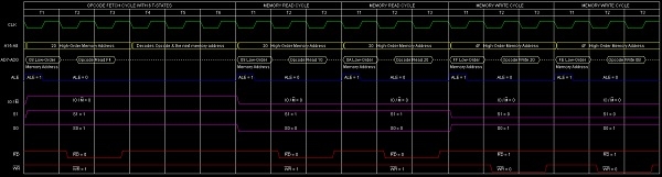 總結 − 所以這個指令CP需要3個位元組,5個機器週期(操作碼獲取、記憶體讀取、記憶體讀取、記憶體寫入、記憶體寫入)和18個T狀態來執行,如時序圖所示。