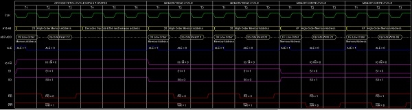 **總結** − 因此,此指令 **CZ** 需要 3 個位元組、5 個機器週期(操作碼獲取、記憶體讀取、記憶體讀取、記憶體寫入、記憶體寫入)和 18 個 T 狀態才能執行,如時序圖所示。