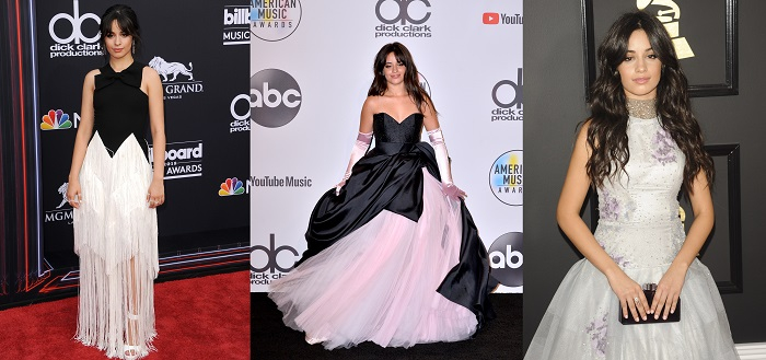 在一個音樂頒獎典禮上,卡米拉穿了一件亞歷山大·麥昆設計的亮紅色露肩禮服。這件禮服飾有開叉和戲劇性的裙襬,她用一對鑽石耳環和一個相配的戒指來搭配這套造型。