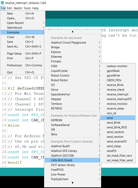 安裝庫後,您可以在**檔案 -> 示例 -> CAN_BUS Shield**中找到 send 和**receive_interrupt**示例。