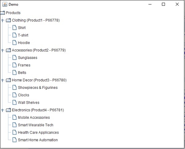 DefaultMutableTreeNode node4 = new DefaultMutableTreeNode("Electronics (Product4 - P66781)");
