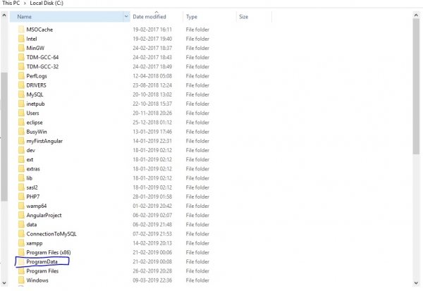 單擊 C 盤。快照如下所示。在這裡,可以看到 Program Data 資料夾 −
