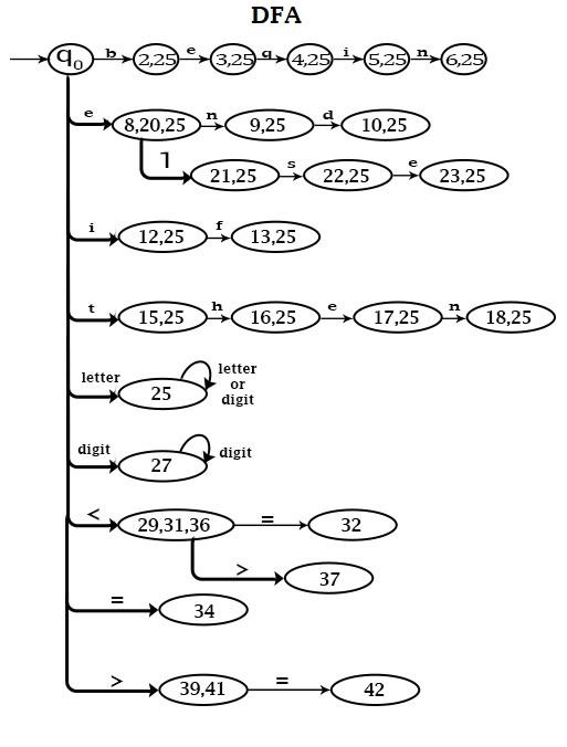 AUXILIARY DEFINITION S letter = A|B|C|…….|Z digit = 0 |1|2|………|9 TRANSLATION RULES begin {return 1} end {return 2} If {return 3} then {return 4} else {return 5} letter (letter+digit)* {value=Install ( );return 6} digit + {value=Install ( );return 7} < {value=1;return 8} <= {value=2;return 8} = {value=3;return 8} < > {value=4;return 8} > {value=5;return 8} >= {value=6;return 8}