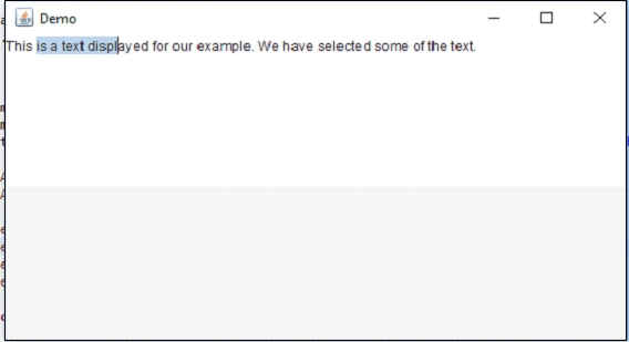 JTextArea textArea = new JTextArea("This is a text displayed for our example. We have selected some of the text.");現在,使用 setSelectionStart() 和 setSelectionEnd() 方法來選擇範圍內的某些文字 -