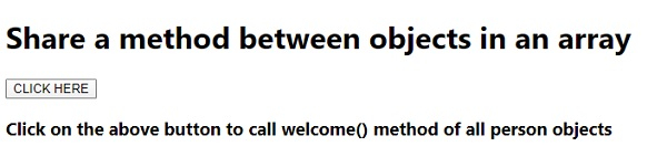 <!DOCTYPE html> <html lang="en"> <head> <meta charset="UTF-8" /> <meta name="viewport" content="width=device-width, initial-scale=1.0" /> <title>Document</title> <style> body { font-family: "Segoe UI", Tahoma, Geneva, Verdana, sans-serif; } .result { font-size: 18px; font-weight: 500; color: rebeccapurple; } </style> </head> <body> <h1>Share a method between objects in an array</h1> <div class="result"></div> <button class="Btn">CLICK HERE</button> <h3>Click on the above button to call welcome() method of all person objects</h3> <script> let resEle = document.querySelector(".result"); function Person(firstName, lastName) { this.firstName = firstName; this.lastName = lastName; } Person.prototype.welcome = function () { return "Welcome " + this.firstName + " " + this.lastName; }; let obj = [ new Person("Rohit", "Sharma"), new Person("Shawn", "Mendes"), new Person("Michael", "Clarke"), ]; document.querySelector(".Btn").addEventListener("click", () => { obj.forEach((item) => { resEle.innerHTML += item.welcome() + ""; }); }); </script> </body> </html>