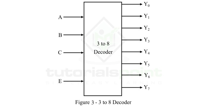 這裡,A、B 和 C 是三個輸入,Y0、Y1、Y2、Y3、Y4、Y5、Y6 和 Y7 是八個輸出。當使能輸入 E 處於啟用狀態時,對於每種輸入組合,這些輸出線中的一條將處於啟用狀態。