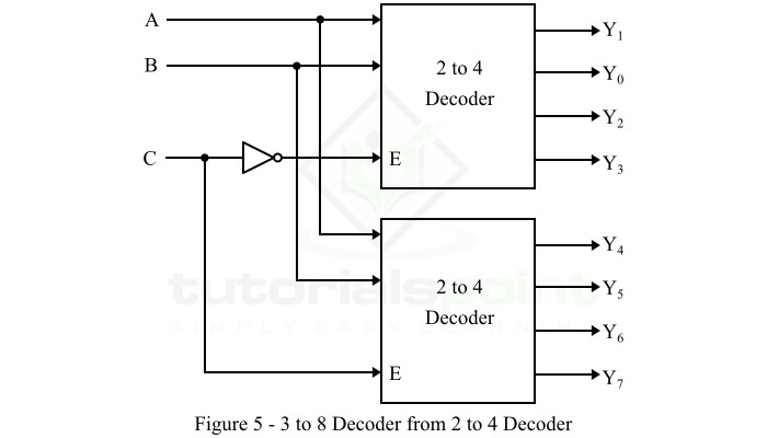 這裡,輸入 A 和 B 並行應用於每個 2-to-4 譯碼器。輸入 C 的補碼連線到上部 2-to-4 譯碼器的使能輸入 E 以獲得輸出 Y0 到 Y3。輸入 C 直接連線到下部 2-to-4 譯碼器的使能輸入 E 以獲得輸出 Y4 到 Y7。