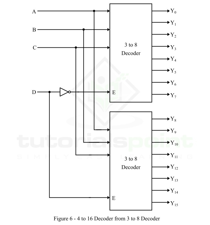 因此,需要級聯兩個 3-to-8 譯碼器才能獲得 4-to-16 譯碼器。