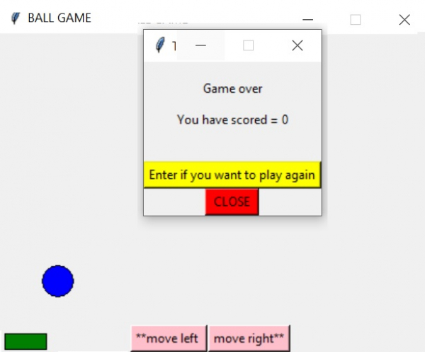 #Catching the ball game using Python from tkinter import Tk, Button, Label from tkinter import Canvas from random import randint base = Tk() base.title("BALL GAME") base.resizable(False, False) color = Canvas(base, width=590, height=610) color.pack() standard = 0 length = 5 marks = 0 class model: def __init__(self, color, m1, n1, m2, n2): self.m1 = m1 self.n1 = n1 self.m2 = m2 self.n2 = n2 self.color = color self.circle = color.create_oval(self.m1, self.n1, self.m2, self.n2,fill="blue", tags='dot1') def Game(self): offset = 5 global standard if standard >= 510: global length, marks, next if (length - offset <= self.m1 and length + 40 + offset >= self.m2): marks += 5 color.delete('dot1') game_play() else: color.delete('dot1') slide.remove(self) result() return standard += 1 self.color.move(self.circle, 0, 1) self.color.after(10, self.Game) class slide: def __init__(self, color, m1, n1, m2, n2): self.m1 = m1 self.n1 = n1 self.m2 = m2 self.n2 = n2 self.color = color self.num = color.create_rectangle(self.m1, self.n1, self.m2, self.n2, fill="green", tags='dot2') def push(self, num): global length if (num == 1): self.color.move(self.num, 20, 0) length += 20 else: self.color.move(self.num, -20, 0) length -= 20 def remove(self): color.delete('dot2') def game_play(): global standard standard = 0 size = randint(0, 570) game1 = model(color, size, 20, size + 30, 50) game1.Game() def result(): base2 = Tk() base2.title("THE BALL GAME") base2.resizable(False, False) set = Canvas(base2, width=300, height=300) set.pack() z = Label(set, text="\nGame over\n\nYou have scored = " + str(marks) + "\n\n") z.pack() btx = Button(set, text="Enter if you want to play again", bg="yellow", command=lambda: repeat(base2)) btx.pack() bty = Button(set, text=" CLOSE ", bg="red",command=lambda: destroy(base2)) bty.pack() def repeat(base2): base2.destroy() function() def destroy(base2): base2.destroy() base.destroy() def function(): global marks, length marks = 0 length = 0 x1 = slide(color, 5, 560, 45, 575) Bt0 = Button(color, text="move right**", bg="pink",command=lambda: x1.push(1)) Bt0.place(x=335, y=580) Bt1 = Button(color, text="**move left ", bg="pink", command=lambda: x1.push(0)) Bt1.place(x=260, y=580) game_play() base.mainloop() if (__name__ == "__main__"): function()