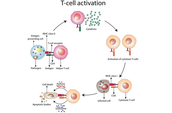 這些胸腺細胞中的每一個都具有隨機產生的特異性。T 細胞將肽抗原識別為肽 MHC 複合物,這些複合物是我們自身的體分子,不識別氨基分離。因此,這些 MHC 稱為自身 MHC 分子。