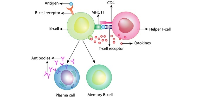 因此,最終,自身反應性 B 細胞在此處變得無功能,因為它們可以產生導致自身免疫性疾病的自身免疫抗體。如果 B 細胞不粘附於基質自身抗原,則它們會遷移到外周淋巴器官,在那裡它們會遇到特定抗原並被啟用、增殖和分化。這些效應 B 細胞稱為漿細胞,它們表達 IgD,然後進入血液。