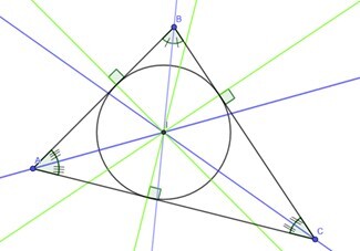 在上圖中,三條內角平分線的交點是內心,用 I 表示。
