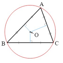在上圖中,三條垂直平分線的交點是外心,用 O 表示。