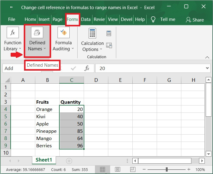 接下來,選擇範圍 C4:C9,然後單擊“**公式**”選項卡,然後轉到“**定義名稱**”組。