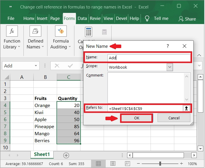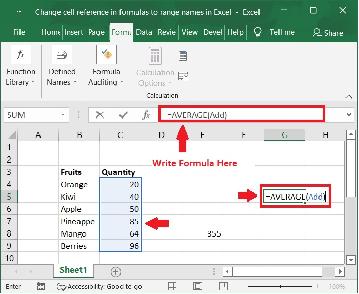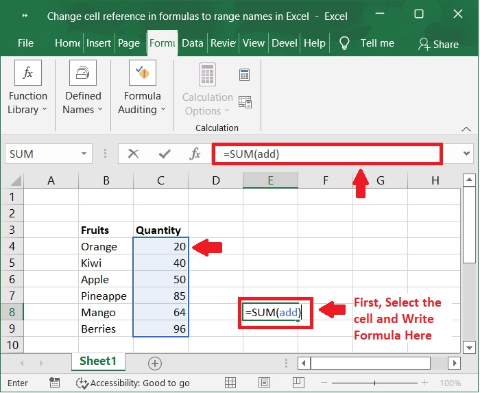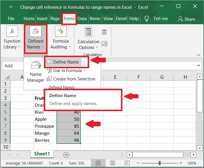 我們可以在公式中使用定義的名稱,而不是在公式中寫入單元格範圍。以下是顯示帶有單元格範圍的公式以及在公式中使用定義名稱的示例。