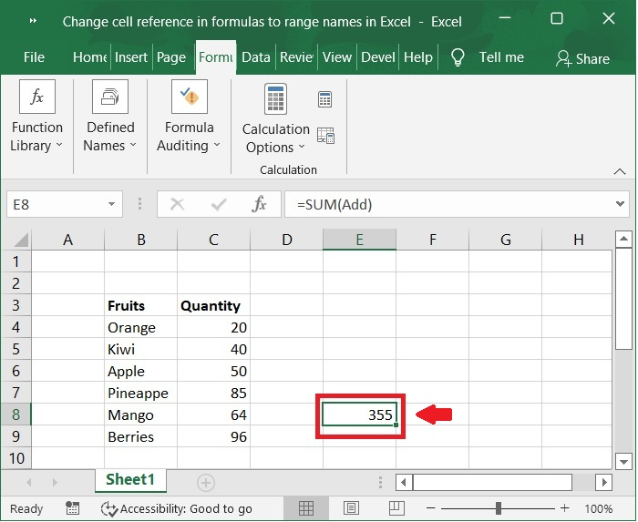 現在,所選命名範圍值的總和已計算並在單元格中顯示。