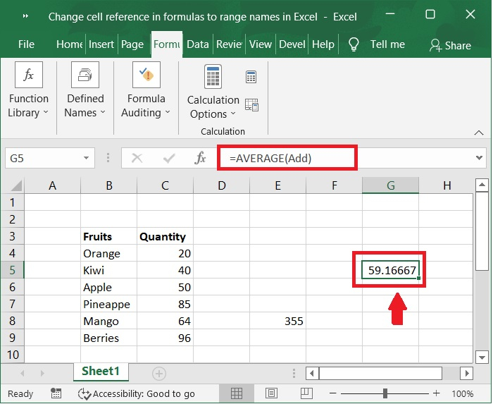 在下面的螢幕截圖中,計算了定義的命名範圍的平均值並在單元格中顯示。