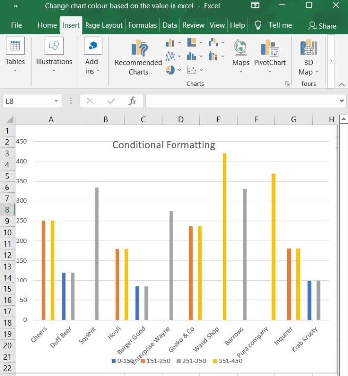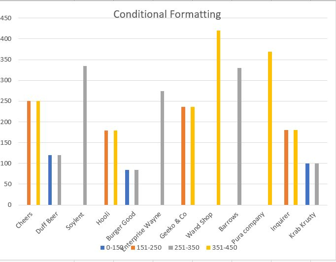 條件格式指的是您可以將圖表中不同的值範圍顯示為不同顏色的過程。這可能是您在某些時候插入圖表時想要做的事情。由於 Excel 功能僅適用於單元格而不是圖表,因此我們可以透過組合不同的資料系列將條件格式的概念應用於柱形圖。這是因為條件格式僅適用於單元格。