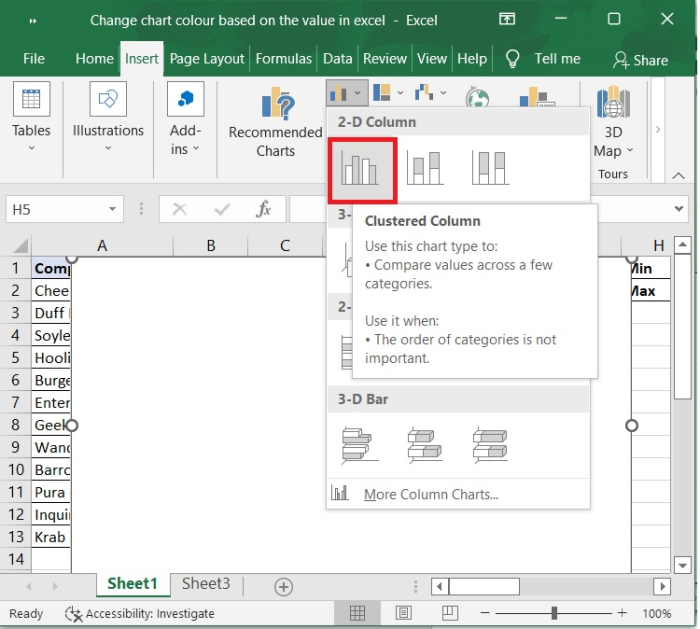 轉到“插入”選項卡 - 選擇“簇狀柱形圖”型別。