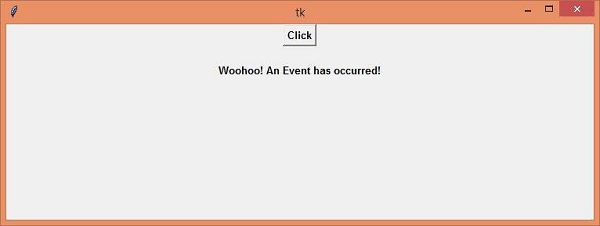 #Import tkinter library from tkinter import * #Create an instance of tkinter frame win = Tk() #Set the geometry win.geometry("750x250") #Define a function to show the text label def text_label(): Label(win, text= "Woohoo! An Event has occurred!", font= ('Helvetica 10 bold')).pack(pady=20) #Configure the Button to trigger a new event button.configure(command= close_win) #Define a function to close the event def close_win(): win.destroy() #Create a Button widget button= Button(win, text= "Click", font= ('Helvetica 10 bold'), command= text_label) button.pack(side= TOP) win.mainloop()