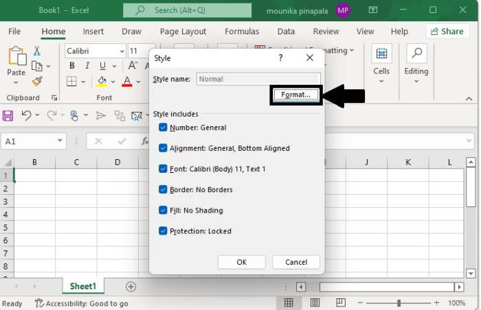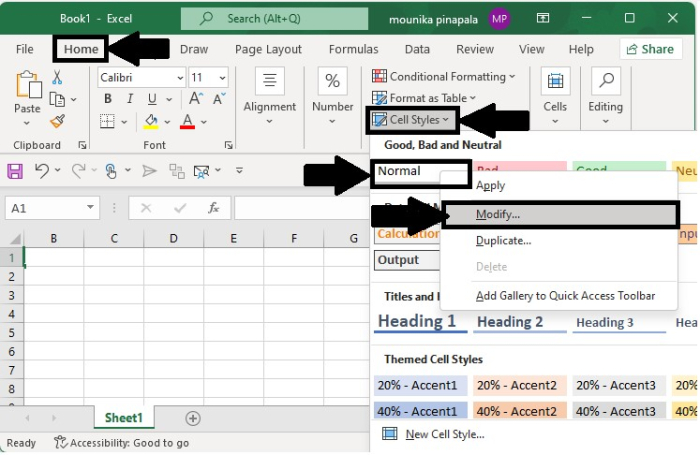 開啟您要更改其行和列標題字型和大小的工作簿。轉到“開始”選項卡,在“樣式”組中,右鍵單擊“常規”,然後從上下文選單中選擇“修改”以開啟“樣式”對話方塊。您也可以透過按鍵盤上的Alt+'(單引號)鍵來獲取此對話方塊。